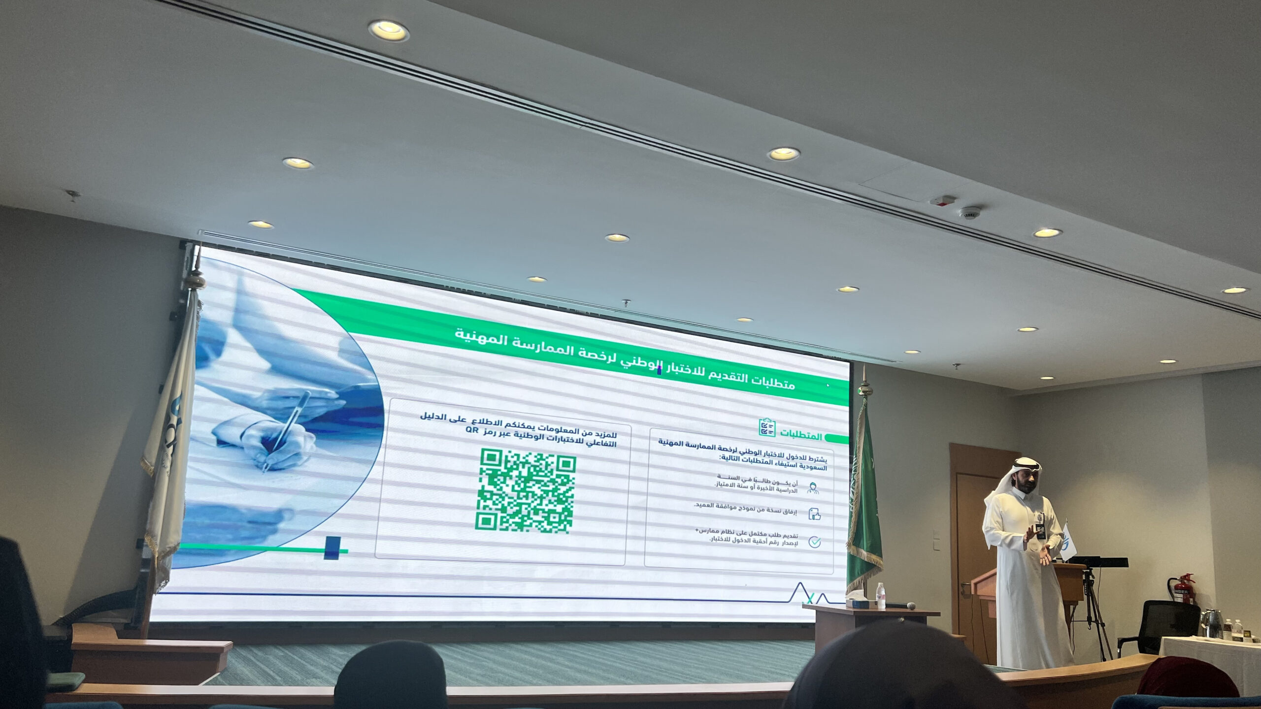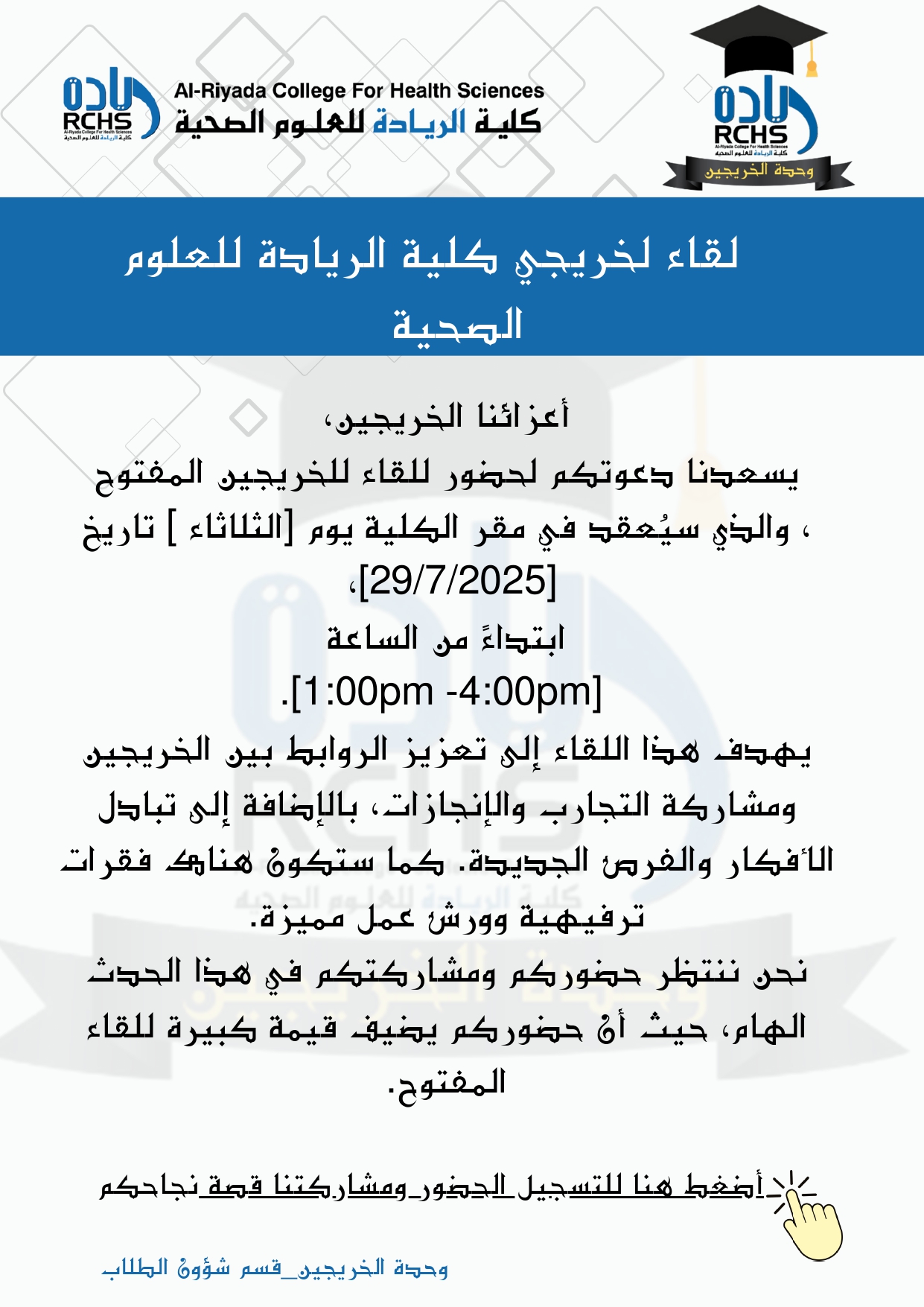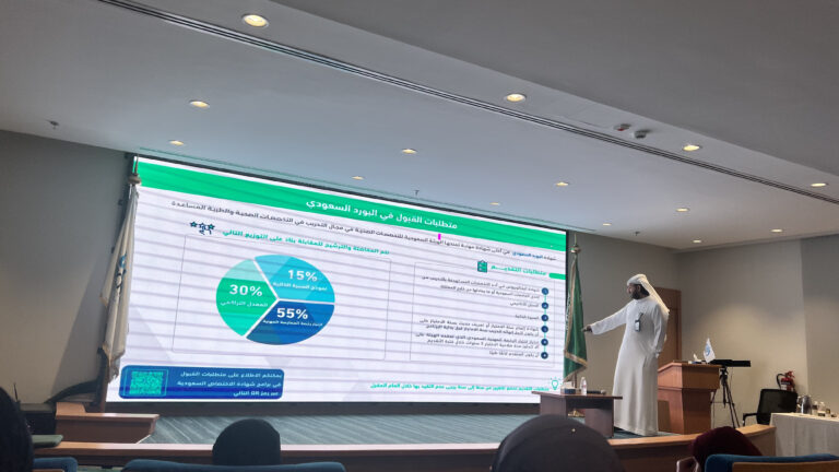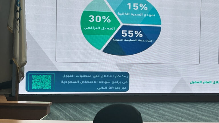 تم تنفيذ خدمة دعم وتثقيف الخريجين من خلال ورشة عمل موجهة للطلاب والطالبات، هدفت إلى التعريف بأهم المحاور المتعلقة بمرحلة ما قبل التخرج وما بعدها، بما في ذلك متطلبات التقديم على برامج الدراسات العليا والحصول على رخصة الممارسة المهنية من الهيئة السعودية للتخصصات الصحية. وقد تضمنت الورشة زيارة متحدث من الهيئة السعودية للتخصصات الصحية، وبمشاركة نخبة من الخبراء، حيث تم استعراض خدمات الهيئة ذات الصلة بالطلبة والخريجين، وشرح إجراءات الترخيص المهني، والإجابة على الاستفسارات المطروحة، بما يسهم في رفع مستوى الوعي والاستعداد المهني لدى المشاركين.
